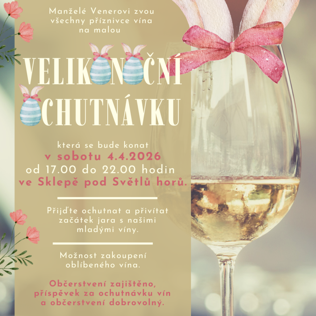 Manželé Venerovi zvou všechny příznivce vína na malou velikonoční ochutnávku, která se bude konat v sobotu 4.4.2026 od 17 do 22 hodin ve Sklepě pod Světlů horů. Přijďte ochutnat a přivítat začátek jara s našimi mladými víny. Občerstvení zajištěno, příspěvek za ochutnávku vín a občerstvení dobrovolný