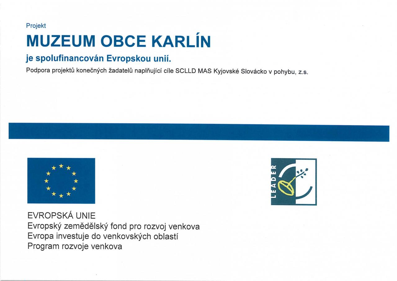 Evropským zemědělským fondem pro rozvoj venkova, Evropa invenstuje do venkovských oblastí a Programem rozvoje venkova.Účelem dotace je rekonstrukce původního hospodářského stavení pro zachování kulturního dědictví - zbudováním MUZEA OBCE KARLÍN.