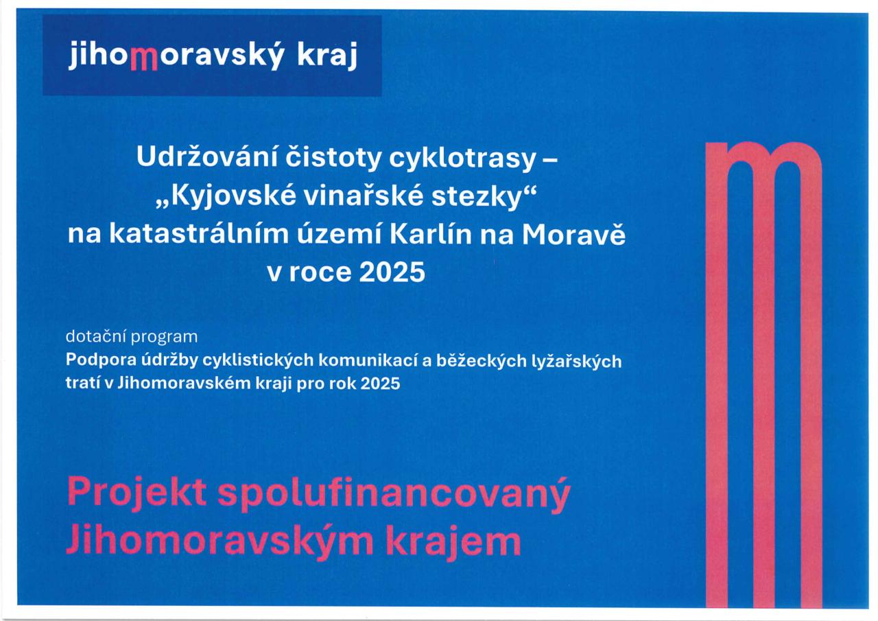 Projekt Udržování čistoty cyklotrasy – „Kyjovské vinařské stezky“ na katastrálním území Karlín na Moravě v roce 2025 byl realizován díky finanční podpoře z rozpočtu JMK - Podpora údržby cyklistických komunikací a běžeckých tratí v JMK pro rok 2025 -DT 1 - Čistota cyklistických komunikací